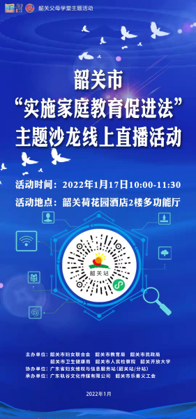 为贯彻落实习近平总书记关于注重家庭家教家风建设的重要论述,推动家庭教育促进法宣传普及和实施,由韶关市妇女联合会主办的“实施家庭教育促进法主题沙龙”活动将在1月17日(星期一)上午10点进行线上直播!