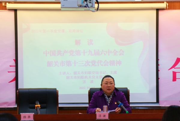 市妇联党组书记、主席、机关党支部书记汪波同志为大家主讲了《学习贯彻市第十三次党代会精神》专题党课,重点解读了中国共产党第十九届六中全会、韶关市第十三次党代会精神以及韶关市“两会”精神,并结合市妇联工作实际提出落实工作系列举措,她指出,全市妇联组织要把牢政治方向,履行政治责任,切实把思想和行动统一到全会精神和市党代会、“两会”精神上来,贯穿引领服务联系全过程各方面,团结带领全市广大妇女听党话、跟党走,团结引领全市妇女为我市争当北部生态发展区高质量发展排头兵贡献巾帼智慧和力量。