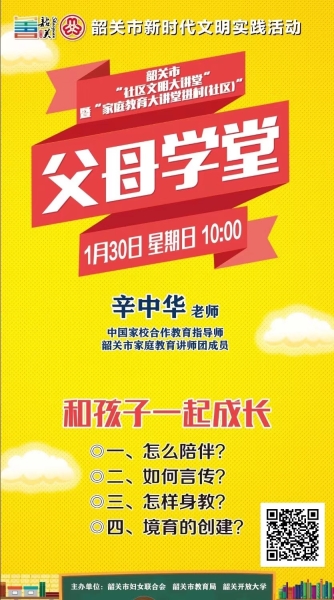 《父母学堂》第二十四期将邀请中国家校合作教育指导师、韶关市家庭教育讲师团成员辛中华老师,以“和孩子一起成长”为主题,围绕“怎么陪伴”、“如何言传”、“怎样身教”、“境育的创建”等方面进行讲授。