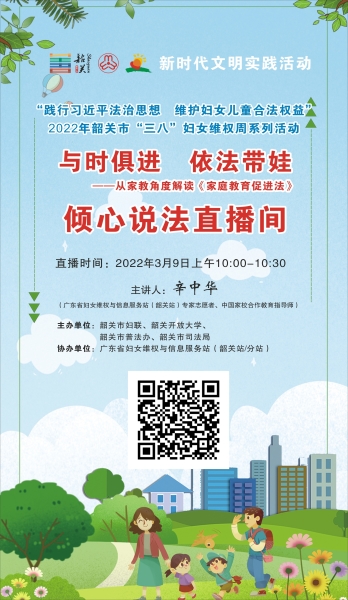 天下之本在国,国之本在家。中华民族历来重视家庭,重视家庭教育。党的十八大以来,习近平总书记围绕注重家庭家教家风建设发表了一系列重要论述。《中华人民共和国家庭教育促进法》的制定和实施将传统的家事上升为新时代的重要国事。结合“践行习近平法治思想 维护妇女儿童合法权益”2022年韶关市“三八”维权周活动开展的契机,韶关市妇联、广东省妇女维权与信息服务站(韶关站)邀请了家庭教育指导师辛中华老师,将走进我们的倾心说法直播间,通过生动案例,从家庭教育角度解读《家庭教育促进法》。欢迎大家届时收看!