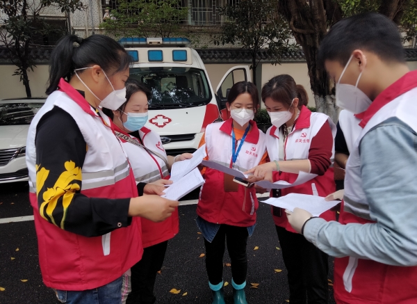 (退休社区党员干部吴丽华(左一)与志愿者们查看当天任务安排)