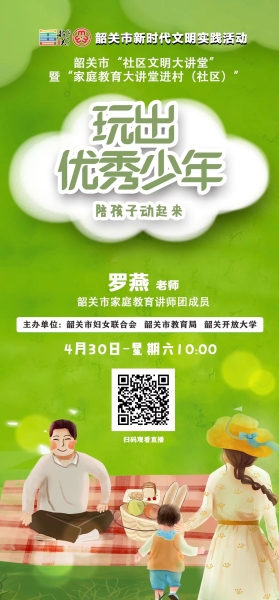 《父母学堂》第三十期将邀请韶关市家庭教育讲师团成员罗燕老师,以“玩出优秀少年——陪孩子动起来”为题,解读家庭教育中家长和孩子之间的相处,围绕“如何孩子建立好‘关系’”、“陪孩子动起来之‘动脑’”等方面进行讲授。