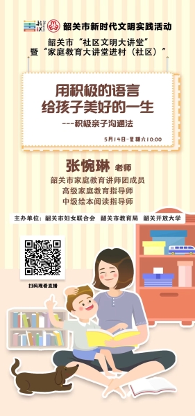 《父母学堂》第三十一期将邀请韶关市家庭教育讲师团成员张婉琳老师,以“用积极的语言给孩子美好的一生——积极亲子沟通法”为题,深度解读家庭教育中积极亲子沟通法的要义,围绕“积极亲子沟通法的要点、方法和要素”、“如何激发孩子的内驱力”等方面进行讲授。