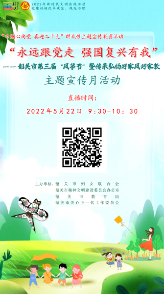 为全面贯彻落实党的十九大和十九届历次全会精神,深入落实习近平总书记关于注重家庭家教家风建设重要论述,突出迎接宣传贯彻党的二十大主线, 推动社会主义核心价值观在家庭落地生根, 助力培养担当民族复兴大任的时代新人, 为迎接党的二十大胜利召开凝心聚力营造氛围,市妇联将联合市文明办、市教育局、市关工委举行“永远跟党走 强国复兴有我”韶关市第三届“风筝节”暨传承弘扬好家风好家教主题宣传月活动。