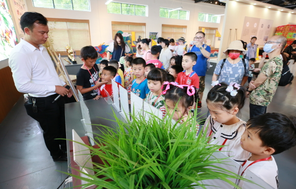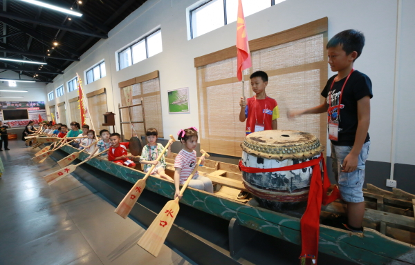 在武江区重阳镇水口龙舟馆,小朋友在讲解员的带领下,了解水口村的龙舟文化,直观深入地学习和体会龙舟文化。