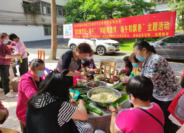 为弘扬中华民族传统美德,增强爱国主义情感,安山社区开展“和睦邻里情,端午粽飘香”活动。活动中,社区志愿者和居民群众把粽叶、糯米、豆子、猪肉等食材摆放在桌子上。居民群众一边说家常、包粽子,一边给不会包的邻里传授经验。李阿姨对社区志愿者说“先将竹叶卷成一个三角筒,然后把糯米、猪肉放进去接着盖好叶子,用水草缠好,一个完整的粽子就包好啦”。跟着李阿姨灵活的动作,社区志愿者也学着做了起来,可是怎么缠绕也好,不是猪肉露出来就是豆子漏出来,形状也是奇奇怪怪,逗得李阿姨哈哈大笑。