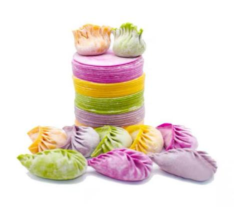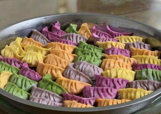 4.开始包“五彩饺子”:由老师提前准备好五彩饺子皮(火龙果、紫薯、南瓜、菠菜、胡萝卜)教孩子们包传统饺子、柳叶饺子、太阳饺子等;