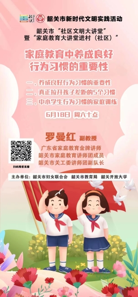 《父母学堂》第三十三期将邀请广东省家庭教育金牌讲师、韶关市家庭教育讲师团成员罗曼红副教授,以“家庭教育中养成良好行为习惯的重要性”为主题,深入阐述良好行为习惯的养成在家庭教育中的影响和作用、从中小学生良好行为习惯的培养等方面进行讲授。