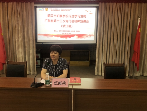 为深入学习宣传贯彻广东省第十三次党代会精神,更好地发挥理论宣讲统一思想、凝心聚力作用,激励广大妇女群众在新时代新征程上担当作为,6月16日,市妇联党组成员、副主席伍海艳带队前往浈江区宣讲省第十三次党代会精神,区妇联主要领导、各街道(镇、办)妇联主席及妇女代表共40人参加了宣讲会。