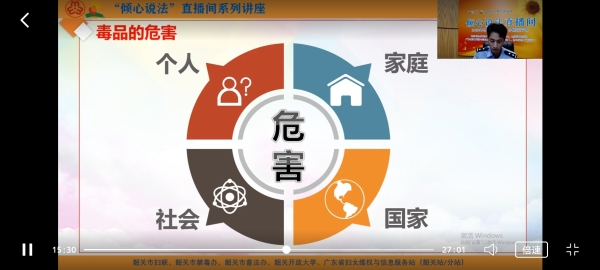 为深入开展“全民禁毒宣传月”系列活动,为构建无毒社会、建设平安韶关贡献巾帼力量,6月24日上午,韶关市妇联联合市禁毒办,在倾心说法直播间举办的禁毒宣传专题小课堂上线,邀请了韶关市公安局禁毒支队民警叶天祥,从“什么是毒品”为切入点,到毒品的概念、毒品和药品的区别、毒品的种类等进行解读。直播在线半小时,目前已吸引5000多人观看学习,后续网友还可通过回放进行观看了解。直播课还得到不少网友留言互动。