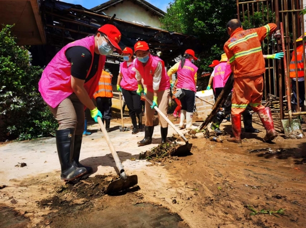 始兴县妇联严格按照县委县政府关于灾后重建部署,全力以赴做好灾后重建工作。6月23日上午,天气转晴、水位消退,始兴县妇联带领乡镇妇联干部和巾帼志愿者,一起奔赴受洪灾最为严重的司前镇开展灾后重建及慰问受灾群众活动。大家扛起锄头,拿起铁锹,推起小推车,清理淤泥、垃圾、树枝,密切配合,协同作战,汇聚了防汛救灾的强大合力,努力帮助受灾群众做好灾后恢复重建工作。