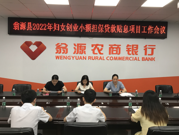 7月18日下午,翁源县妇联联合县财政局、县农商行、周陂镇分管领导在县农商行3楼会议室召开妇女创业小额担保贷款贴息项目工作会议,总结翁源县2022年上半年妇女创业小额担保贷款贴息项目工作情况,交流好经验好做法,对下半年项目实施进行再动员、再部署、再推进,以实际行动帮助妇女解决创业资金问题。