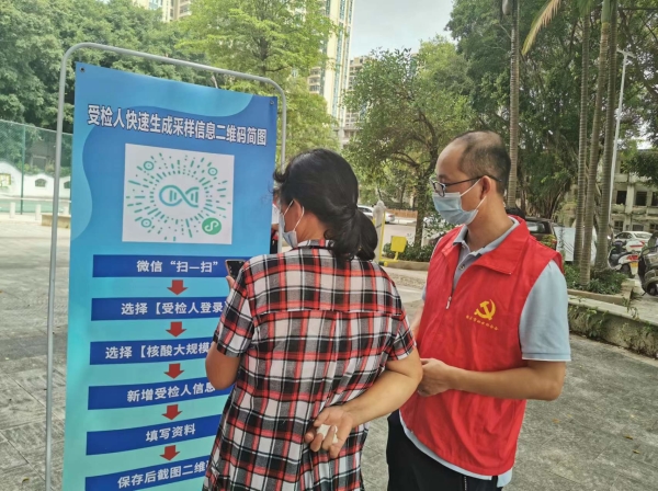 一个拄着拐杖的老人,可能是因为天气太热,有点心急,表述不清楚,党员志愿者们主动上前帮忙,细心询问,扫码,注册信息,帮助他快速便捷完成了检测,老人家感动不已。