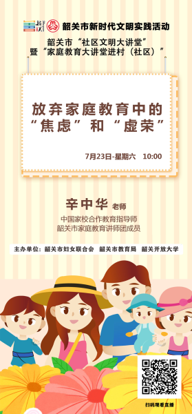 《父母学堂》第三十四期将邀请中国家校合作教育指导师、韶关市家庭教育讲师团成员辛中华老师,以“放弃家庭教育中的‘焦虑’和‘虚荣’”为主题,从深入分析家长在家庭教育中“焦虑”的来源等方面进行讲授。