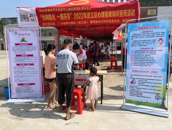 为广泛宣传心理健康知识,引导广大妇女儿童注重心理健康,远离心理疾病,引导群众应用心理健康知识解决日常生活中遇到的心理问题,7月28日,武江区妇联、舒心驿站(武江站)在重阳镇水口村开展“心向阳光 一路芬芳”心理健康知识宣传活动,为当地的村民、妇女儿童群众宣传和普及相关心理健康知识。