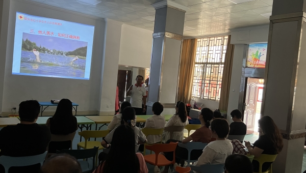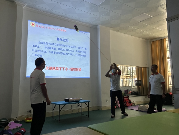 此次水上安全知识专题讲座分为两个环节进行,一是水上安全知识授课和演示;二是进行心肺复苏(CPR+AED)练习。在第一个环节,黄队长首先从水上安全基本知识讲起,尤其讲到因为水下环境复杂,充满了极大的风险,任何人不能到不明水域游泳。其次讲了如果自己落(溺)水,在水中开展自救的方法:一是必须做到不要慌张,发现周围有人时立即呼救;二是放松全身,通过水母漂、仰漂、抱枕漂等方法保持体力,等待救援;三是可利用长衣、长裤打水充气形成气囊借物漂浮于水中,节省更多的体力等待救援;四是发生脚掌、小腿和大腿等不同部位抽筋时的拉伸自解方法。