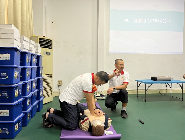 最后讲解心肺复苏(CPR+AED)急救知识:一是人体模型吹气+胸外按压的方法、技巧;二是自动体外除颤器(AED)的使用场合和使用方法。其他两位志愿者进行了相关项目的演示,除了正确的演示,他们还演示了容易犯错的做法和动作,避免对溺水者进行施救时,因方法不正确造成对溺水者的二次伤害,更要避免把自己搭进去。