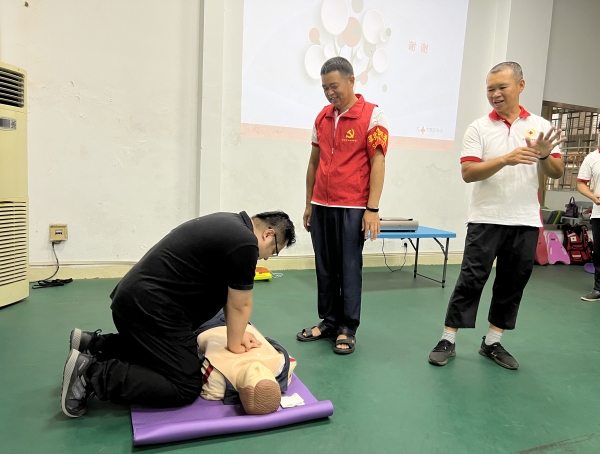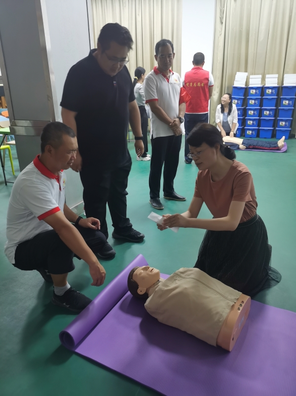在第二个环节,市妇联的领导和干部职工在模拟人体道具上进行心肺复苏的实操练习,黄队长和志愿者在一旁耐心细致地进行指导,纠正错误的动作,力求让每一位干部职工的动作做到标准、按压力度、深度合适。