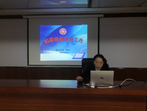 市妇联权益部部长刘秋兰为大家作涉妇女儿童舆情应对工作和妇联维权业务培训,从维权服务、普法宣传、参与社会治理三大板块,深入浅出地讲解了重点人群和家庭关爱服务、强制报告、信访工作、涉妇女儿童权益问题的舆情应对、婚姻家庭纠纷调解服务、妇女议事会等方面的基本要求和具体工作内容,传授维权业务知识。