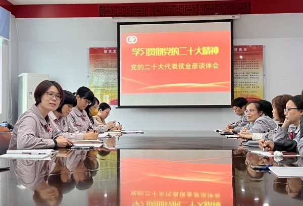 党的二十大胜利闭幕后,二十大代表侯金彦带着满满的收获,向韶关发电厂女职工们分享出席盛会的喜悦,传递党的声音。近日,韶关发电厂行政楼七楼党员活动室内能量满满,侯金彦正与该公司工会女职委委员、侯金彦创新工作室、侯金彦广东省三八红旗工作室成员热切交流。