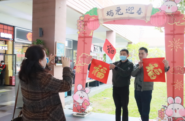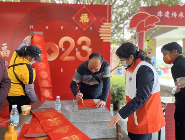 揭牌当日,“巾帼向阳花”们还在服务区开展了“情满旅途 畅享交通”“非遗传承 巾帼先行”“兔年大吉 挥春送福”等志愿服务。“冬去山川齐秀丽,喜来桃李共芬芳”,“新年大吉”…… 一句句饱含喜庆寓意的话语跃然红纸之上,真诚的祝福溢于字里行间,赢得了过往旅客的阵阵掌声与喝彩!2个小时的志愿活动里,共送出超100余幅春联和150多个“福”字。