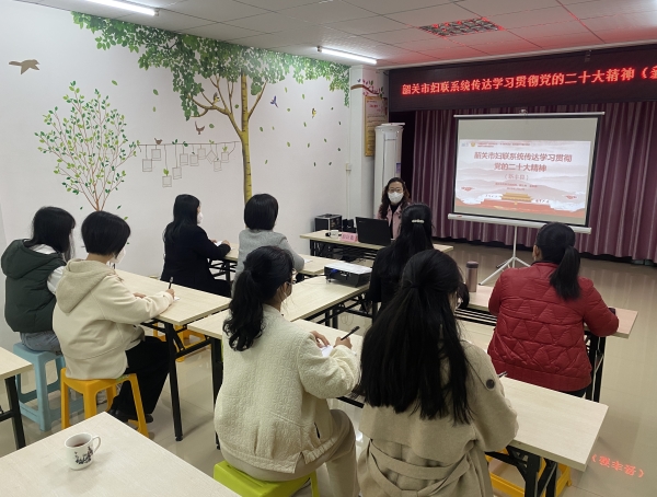 开展党的二十大精神宣讲。1月12日,市妇联党组成员、副主席彭跃勤带队前往新丰开展党的二十大精神宣讲活动。在新丰县红枫家庭服务中心,彭跃勤从党的二十大会议概况,省委、市委和全国妇联、省妇联宣传贯彻党的二十大精神相关会议精神等角度全面系统地解读了党的二十大精神。她指出,各级妇联组织要全面、系统、深入学习,完整、准确、全面领会党的二十大精神;要继续开展“巾帼心向党”系列主题宣传活动,推动党的二十大精神深入妇女人心;要聚焦新时代党的中心任务,推动党的二十大精神在全市妇联系统落地落实,团结引领全市广大妇女踔厉奋发、勇毅前行,为韶关高质量发展贡献巾帼力量。