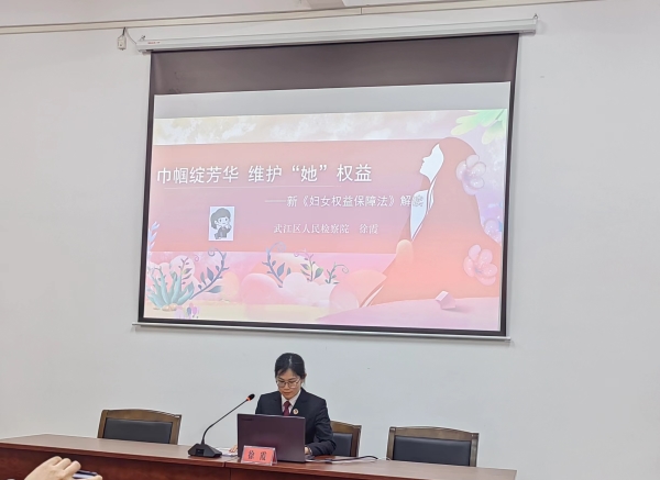 接着,区检察院第一检察部主任徐霞为参会人员进行《中华人民共和国妇女权益保障法》解读,分别对妇女依法享有的政治权利、人身和人格权益、文化教育权益、劳动和社会保障权益、财产权益、婚姻家庭权益、救济措施和法律责任等方面进行了学习。进一步深化了武江区法治宣传教育,提升了妇女干部职工们知法、懂法、用法的能力。