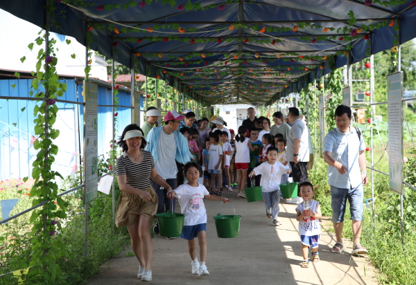 首先是劳作大比拼。孩子们分为两组,在长廊接力赛跑。孩子们提着小桶,把水运到对面的终点的大水桶中。看到孩子们玩得开心,家长们也忍不住拿起扁担挂着水桶参与其中。