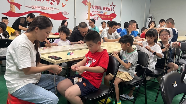 第三个环节是五彩绳编织。老师给大家详细讲解编绳的基本步骤和编织要点,家长们和孩子们仔细地学习研究、互相讨论、慢慢绕线,小小的彩线在巧手中翻飞,编绳的动作逐渐熟悉起来。绕绳的同时点缀上不同款式的小饰品,编织成了各具特色的手绳。