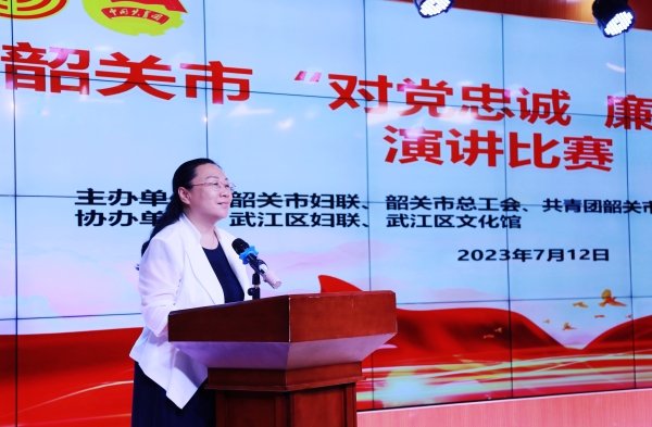 为深入学习贯彻习近平新时代中国特色社会主义思想,深入学习贯彻党的二十大报告提出的“加强新时代廉洁文化建设,教育引导广大党员、干部增强不想腐的自觉,清清白白做人、干干净净做事”要求,大力弘扬廉洁文化主旋律,努力营造“对党忠诚 廉洁齐家”的良好社会氛围,7月12日,市妇联联合市总工会、团市委在武江区文化馆举行韶关市“对党忠诚 廉洁齐家”演讲比赛,全市共12个单位派出选手参加比赛。市人大、市妇联、市总工会、团市委等单位领导莅临指导。