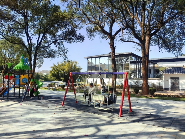 适儿化改造,建设“家门口”的儿童友好场景。在设计庭院之初,陈建禄便立足儿童需求,精心设计了儿童游乐、运动等功能区域。在游乐区,配备了滑梯、秋千,并铺设了防滑、防摔地毯,为孩子们提供了一个安全、有趣的娱乐空间。在运动区,设有篮球场、游泳池、羽毛球场、乒乓球桌、户外健身器材等,并在旁边张贴安全提示标语,为儿童提供一站式的运动休闲服务。