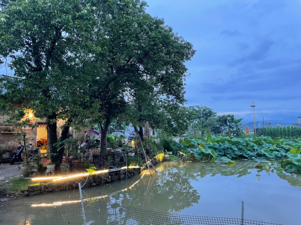 沈国富庭院又名求是斋,是湖心坝客家古围楼群的一座古围屋,曾被广东省人民政府评为“光荣烈属”。“求是斋”整体建筑结构由“一进古建、二进中庭、三进楼房”组成。“一进古建”区域为客厅、茶室,使用仿古留声机、客家文化图书角等进行装潢,古香古色。“二进中庭”有一口古井、一颗龙眼树,悬浮步梯可行至古建楼阁,中西风格结合。“三进楼房”是居住使用,书房、卧室、厨房等功能区划分明显,干净舒适。庭院内和周边精心种植了兰花、长寿花、绣球等绿植,并利用竹子、旧瓦罐等进行装饰,别有一番风味。门前有一片荷塘,当荷花盛开时,碧波潋滟,荷花随风摇曳,荷香沁人心脾,为庭院增添了一抹亮色和几许诗意。