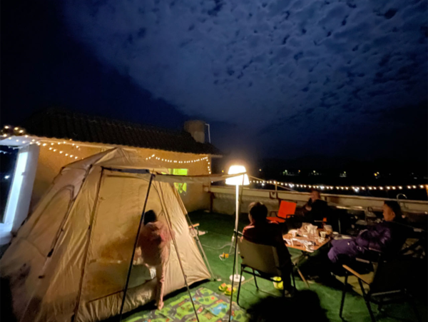 美丽庭院+乡村民宿,诗意栖居的田园梦。2023年,沈国富将古围屋进行翻新,精心打造成一处充满魅力的乡村民宿,既保留了乡村的原始韵味,又融入了现代生活的舒适与便捷,让游客在享受田园风光的同时,也能体验到家的温馨。天台则打造成烧烤、露营区,优美的景色、舒适的环境吸引了一批又一批游客。此外,民宿还提供本地文化体验活动,如制作米饼、参与传统节日庆典等,给游客带来更加丰富生动的体验。