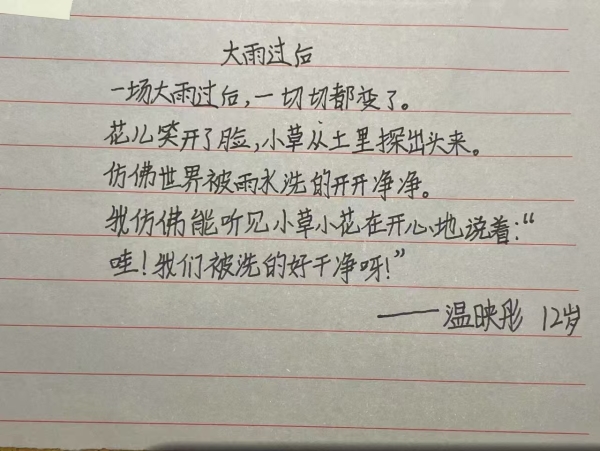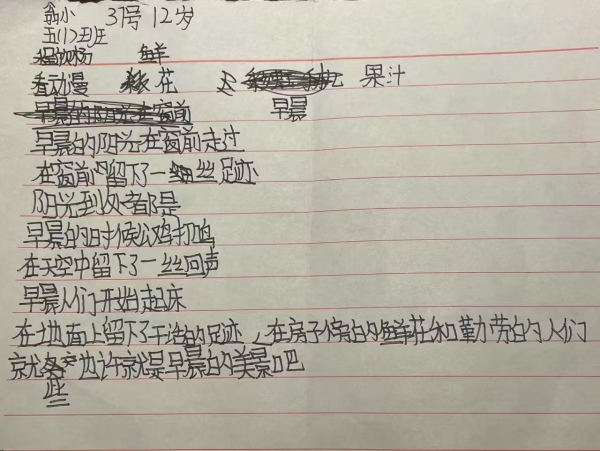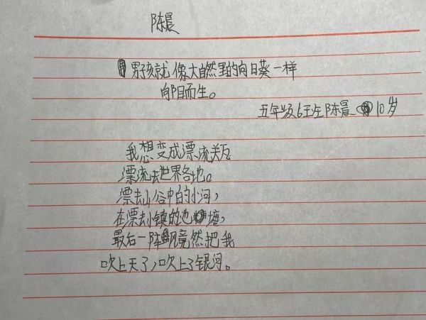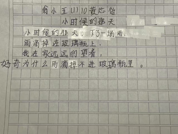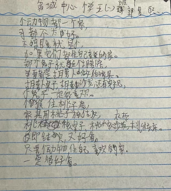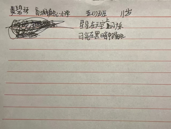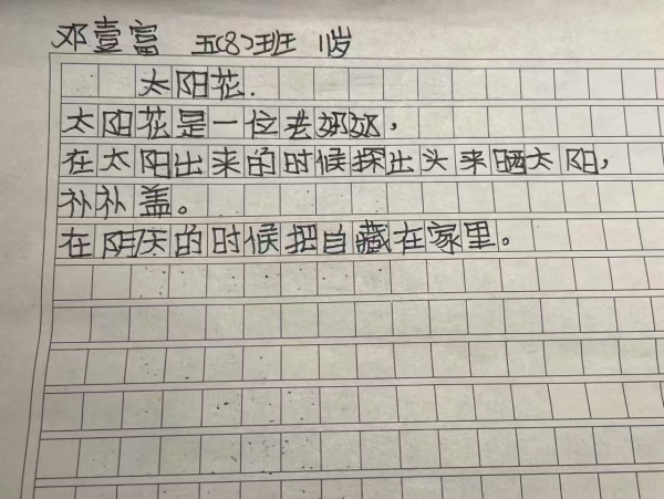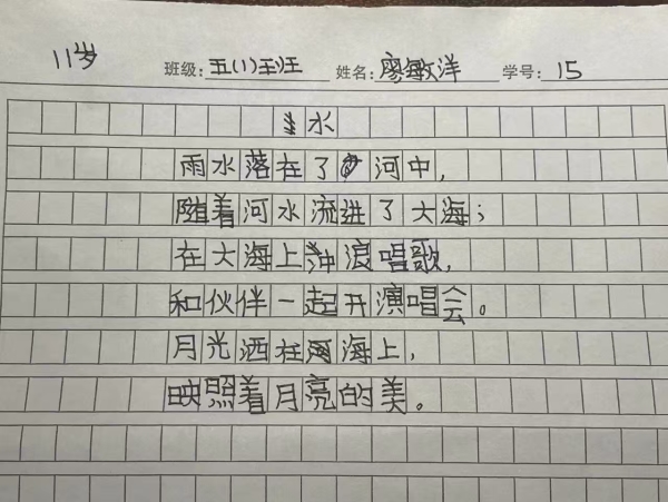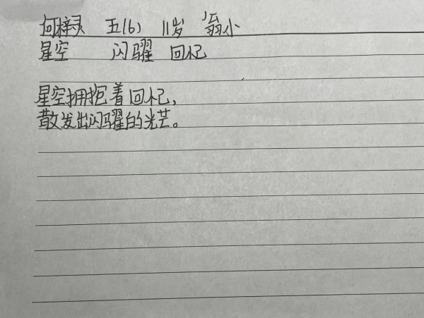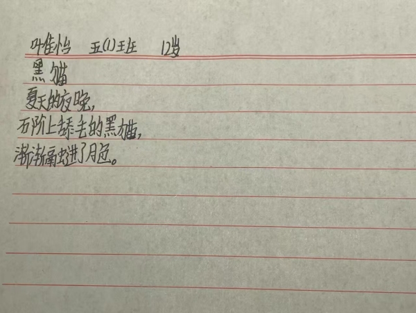 我也给同学看了几首小诗,作为例子,主要是让大家更容易理解要写什么、怎么写。开始创作的时候,大部分同学都能快速地动笔,但也有一些同学不知道写什么。有一位同学就和我说不知道写什么,我在一旁引导她。