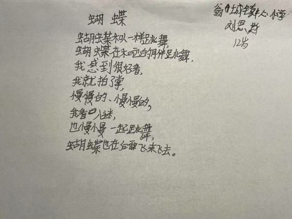 最后她按照这些思路写了蝴蝶跳舞,尤其是“看入迷”这几句写出了自己的想法,写得挺有趣的。