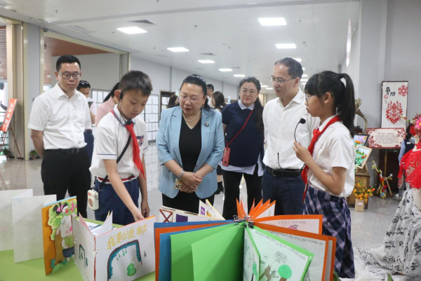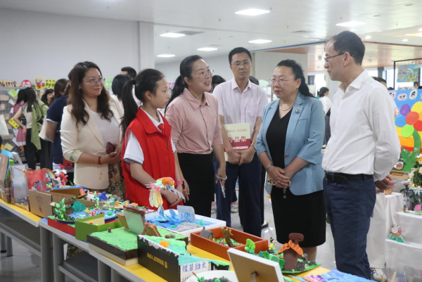 开幕式结束后,领导、嘉宾和家长代表参观了丰富多样的作品展。二楼展区内,初中、小学主题展区的阅读成果琳琅满目,阅读计划表、成长手册、阅读日记、手抄报、思维导图、读书心得等作品,凝聚着学生们对阅读的热情与思考。书香校园展区则集中展示了碧桂园外国语学校、和平路小学、执信小学、吴礼和中心小学、建国幼儿园、东鹏幼儿园、红玫幼儿园、金葵幼儿园八所学校(幼儿园)在书香校园建设方面的突出成果,展现出浓厚的书香校园文化氛围。一楼互动区的“我最爱的书”投票墙和“书香寄语”留言板前,观众们积极参与,留下对书籍的热爱与感悟。