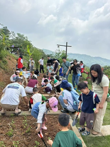 活动尾声的亲子劳作环节,家长和孩子携手种植西瓜苗。大家虽挥汗如雨,但乐在其中,真切体验到劳动的艰辛与快乐。种植结束后,每组家庭在西瓜苗旁挂上写有家庭名字和寄语的小牌子,开启“西瓜成长之旅”,这既肯定了孩子的劳动成果,也见证其成长历程。
