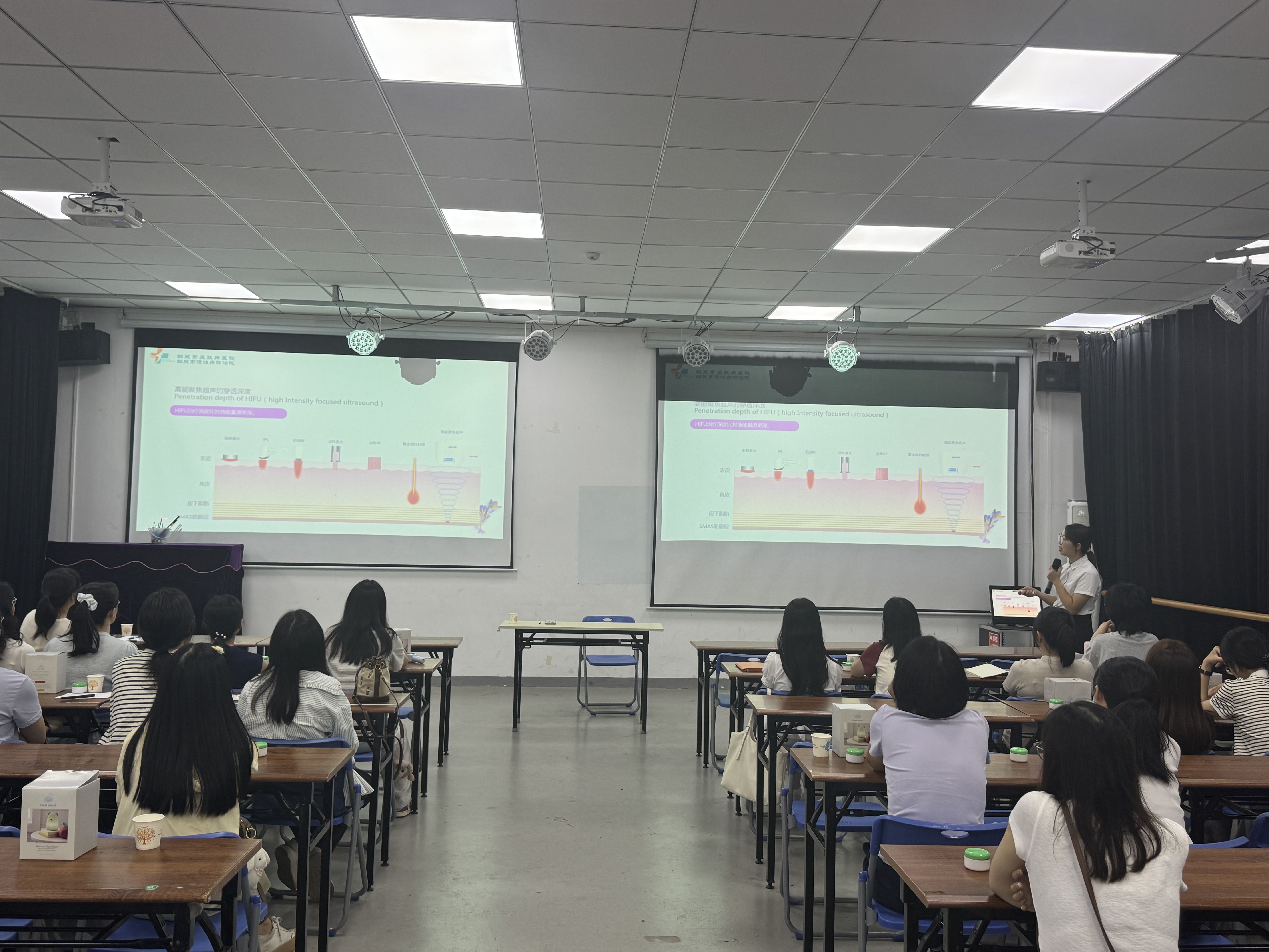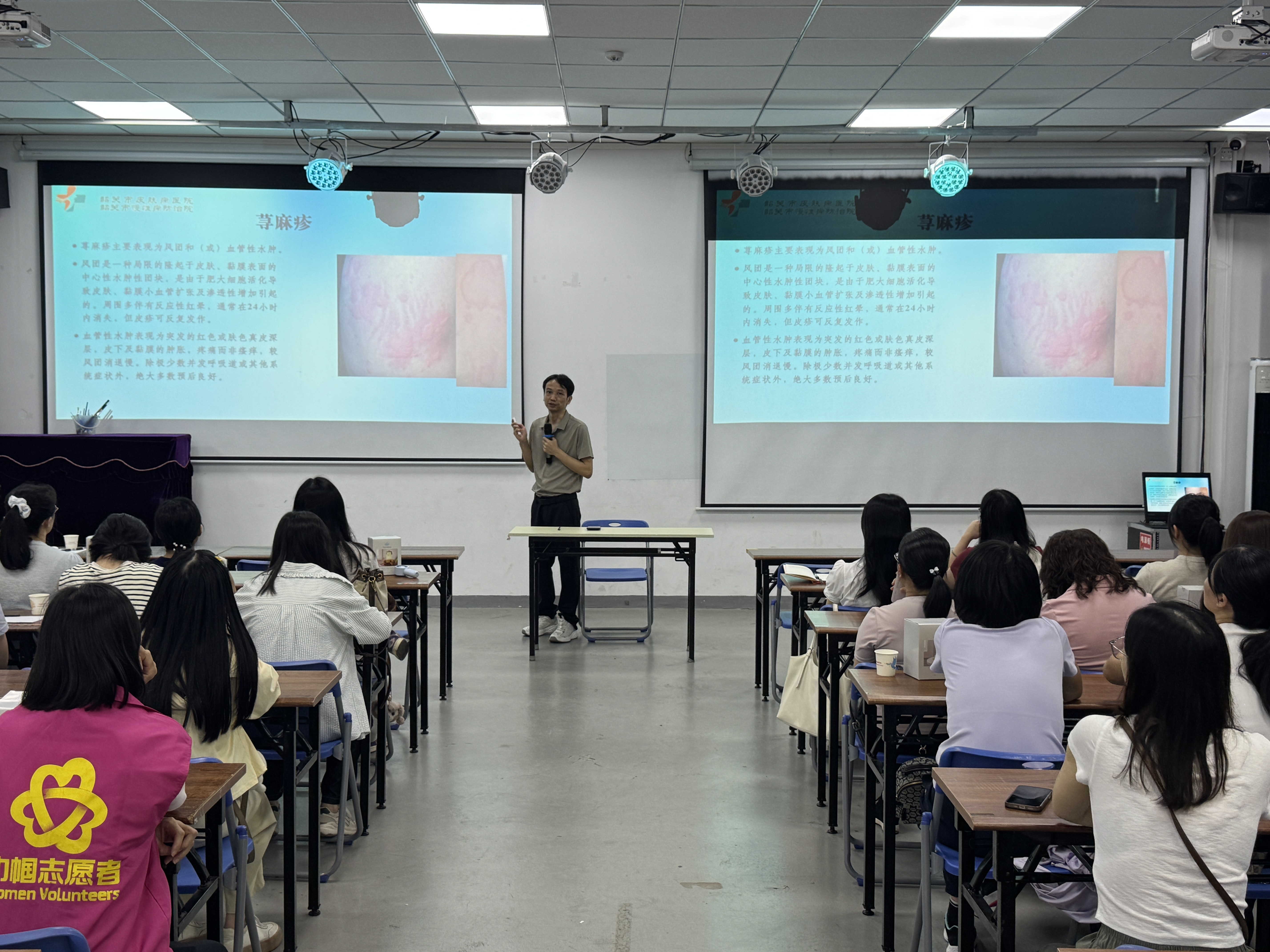 活动特邀韶关市慢性病防治院专家团队进行专题授课。医美科副主任黄志雄以《常见皮肤病的防治》为主题,结合临床案例分析常见皮肤病预防治疗要点及科学护肤方法,通过图文展示深入浅出解析皮肤问题成因与护理技巧;健康宣讲员何美婷则系统讲解《医美科常见物理治疗》,科普激光美容、光子嫩肤等技术原理及适用人群,引导女性理性选择医美项目。