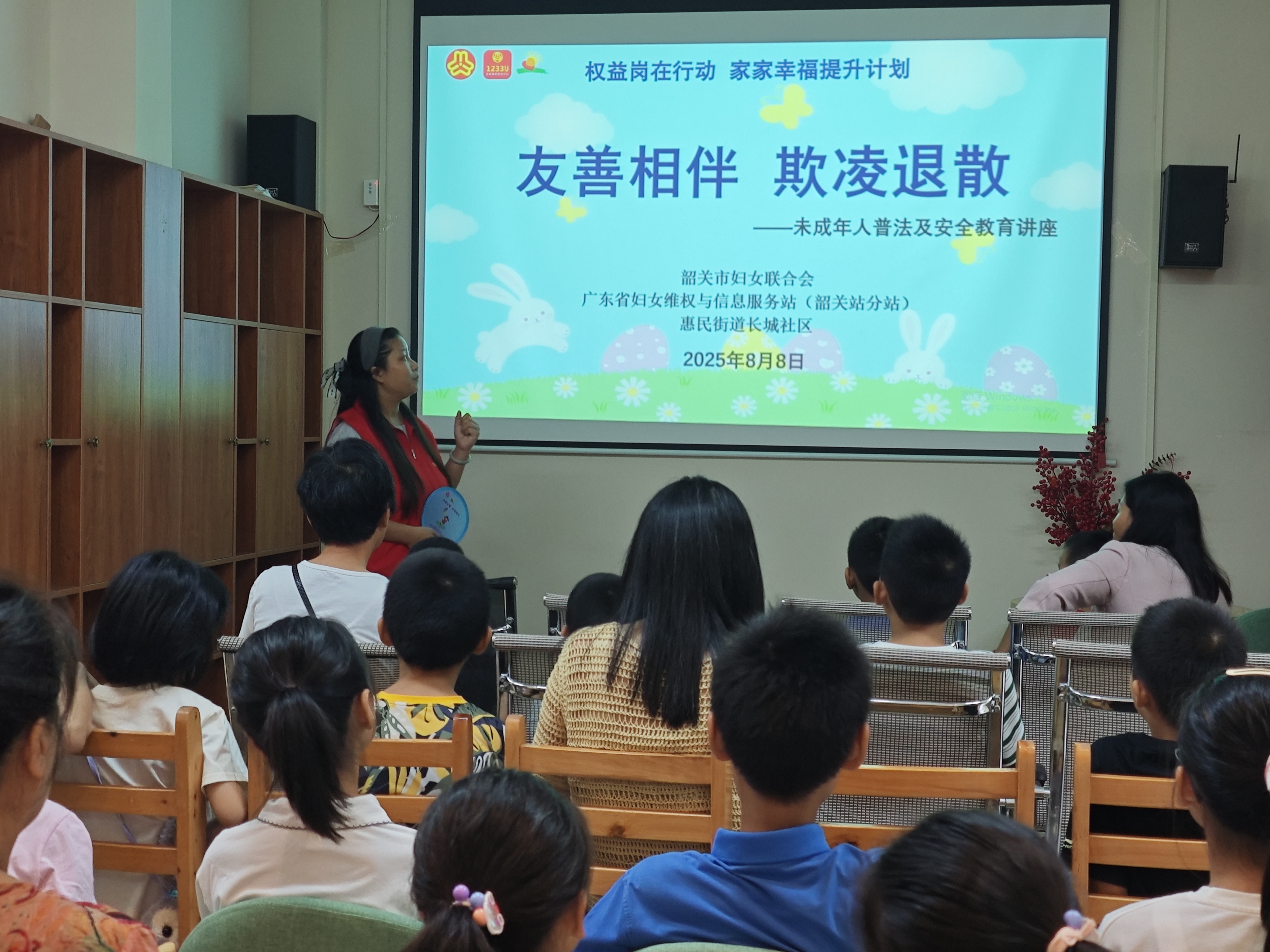 为强化未成年人的自我保护意识,提升家庭监护能力,聚焦预防学生欺凌与家庭教育的重要性,营造有利于未成年人健康成长的温馨家庭氛围与良好社会环境,近期,韶关市妇联、广东省妇女维权与信息服务站(韶关站分站)先后走进武江区长城世家小区、浈江区天泓居小区,分别开展了“家家幸福提升计划”之“友善相伴 欺凌退散”未成年人普法及安全教育讲座、“守护幸福家 智慧伴您行”家庭关系讲座,共计约60人次参加活动。