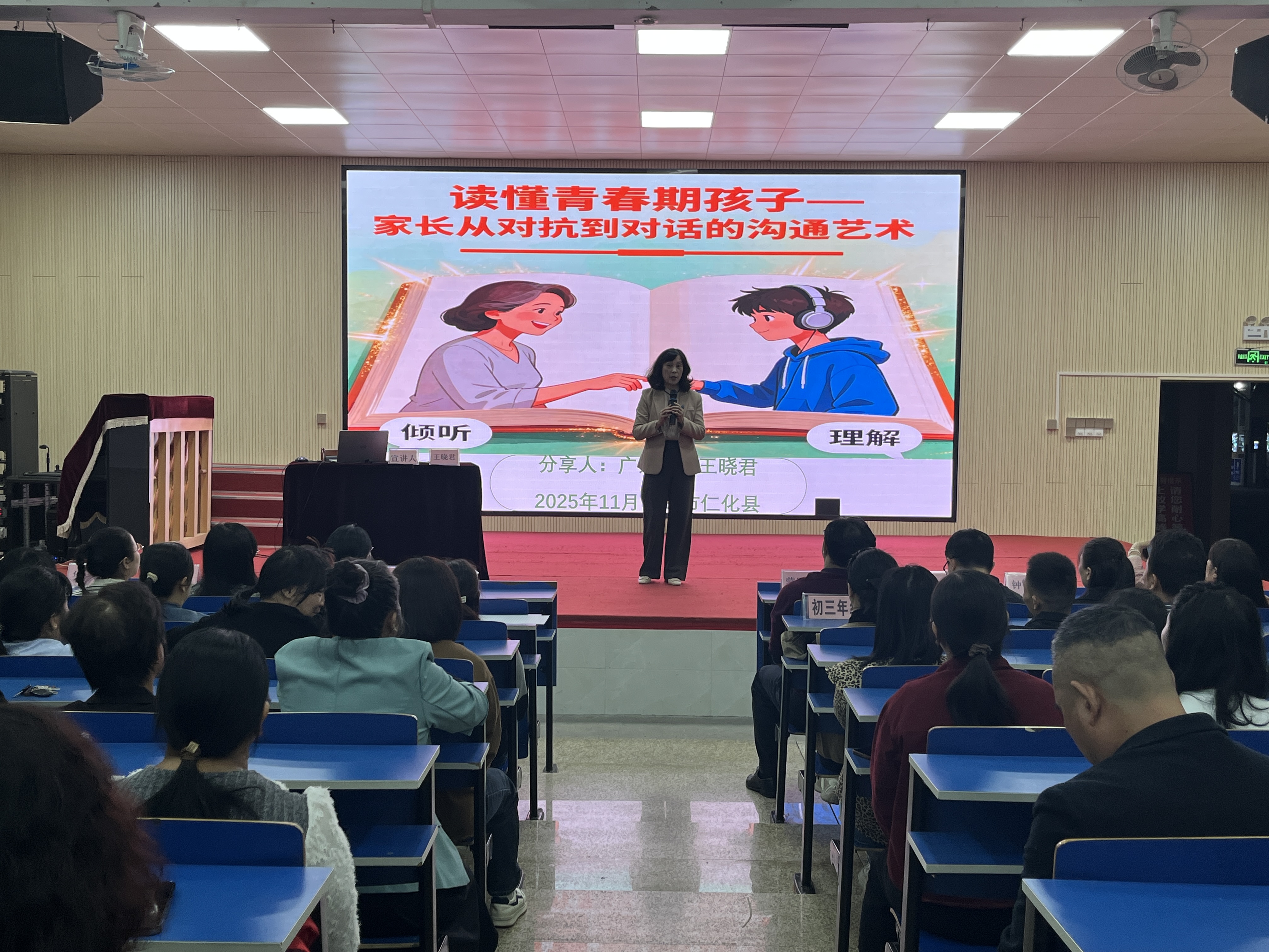 11月2日晚,首场家庭教育宣讲活动在仁化县第一中学拉开帷幕,近400名学生家长现场参与。王晓君老师围绕“读懂青春期孩子:家长从对抗到对话的沟通艺术”主题展开分享。王老师结合多年案例经验,从青少年心理发展规律、亲子沟通常见误区、家风建设重要意义等方面进行系统讲解,重点针对青春期孩子特点、沟通技巧等家长普遍关心的问题提供实操性解决方法。“这次宣讲让我明白了和孩子平等沟通的重要性,以前总习惯说教,效果反而不好,回去要试着用王老师教的方法试试。”一位初中学生家长会后分享道。