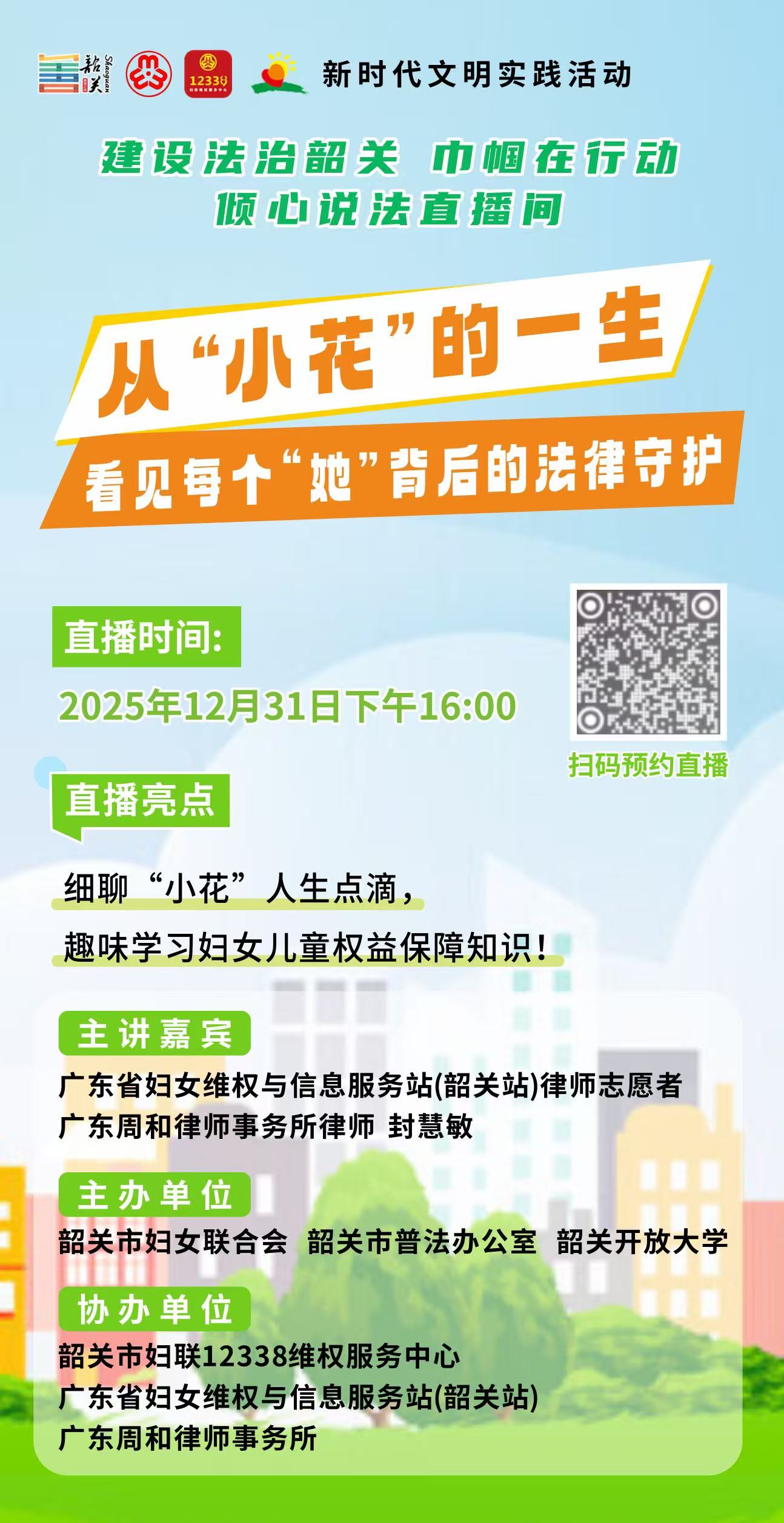 为精准回应女性群体法治需求、守护妇女儿童合法权益,2025年12月31日下午,“倾心说法直播间”第50期线上课程从“小花”的一生,看见每个“她”背后的法律守护,特邀广东省妇女维权与信息服务站(韶关站)专家志愿者、广东周和律师事务所合伙人律师封慧敏为我们带来专业的法律解读与权益守护分享,吸引近150名观众观看互动。陆续还有群众通过回放观看。