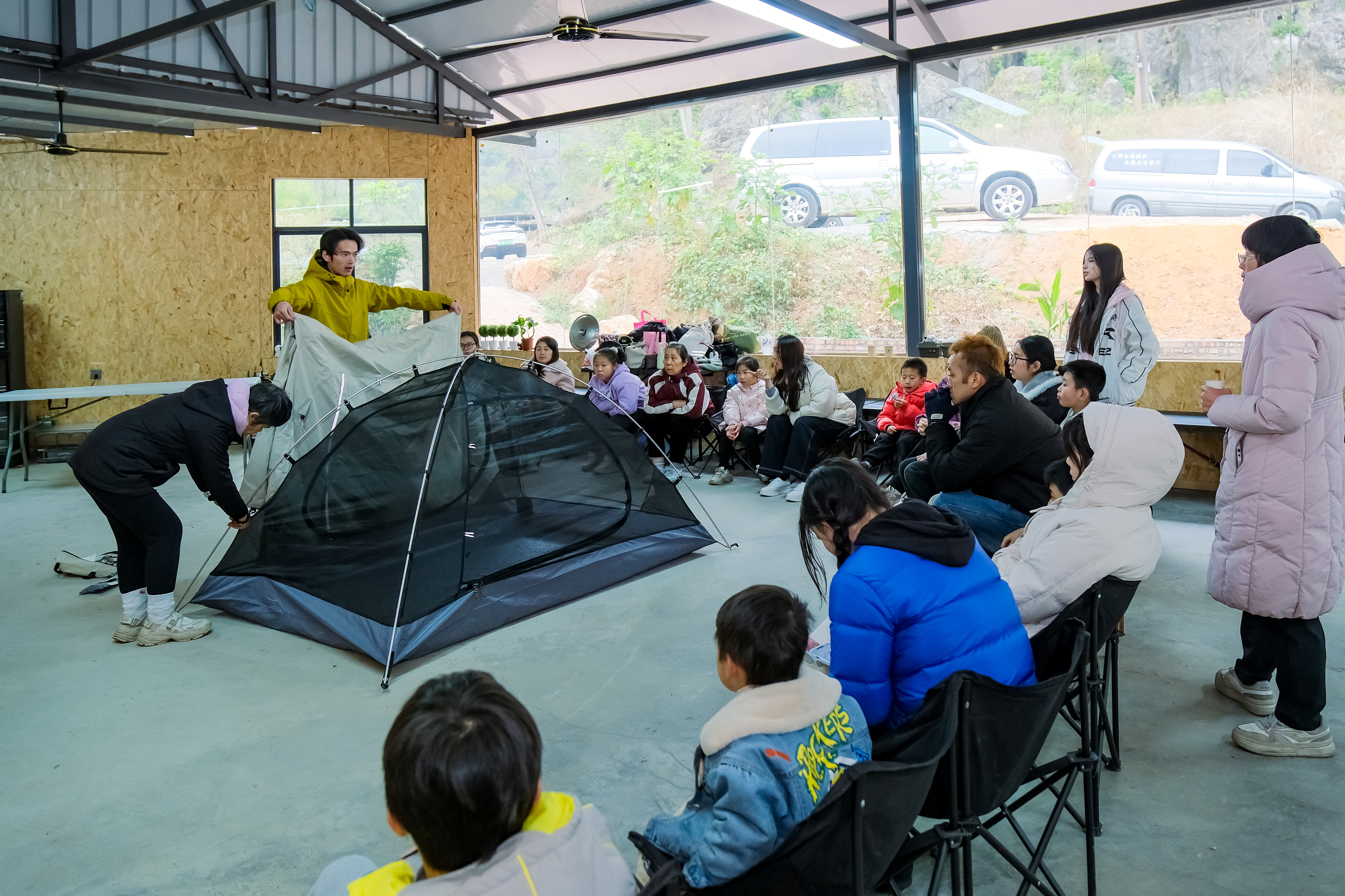 下午,户外生存技能体验活动正式开展,“亲子搭帐篷”实操学习深受亲子家庭喜爱。光合探索微探险营地专业教练现场授课,结合少年儿童的认知特点,用通俗易懂的语言讲解帐篷的构造、搭建原理及户外安全注意事项,从支架组装、篷布固定到地钉加固、防风绳调节,每一个步骤都细致演示、耐心指导,手把手带领参与家庭解锁户外生存实用技能。亲子家庭分工协作、动手实践,有的组装支架、有的固定篷布、有的调整绳结,在欢声笑语中完成帐篷搭建。参与家庭纷纷表示,此次搭帐篷实操活动干货满满,既让孩子们学到了实用的户外技能,也为家长与孩子提供了亲近自然、增进感情的优质平台,真正实现了“在实践中学习、在陪伴中成长”。