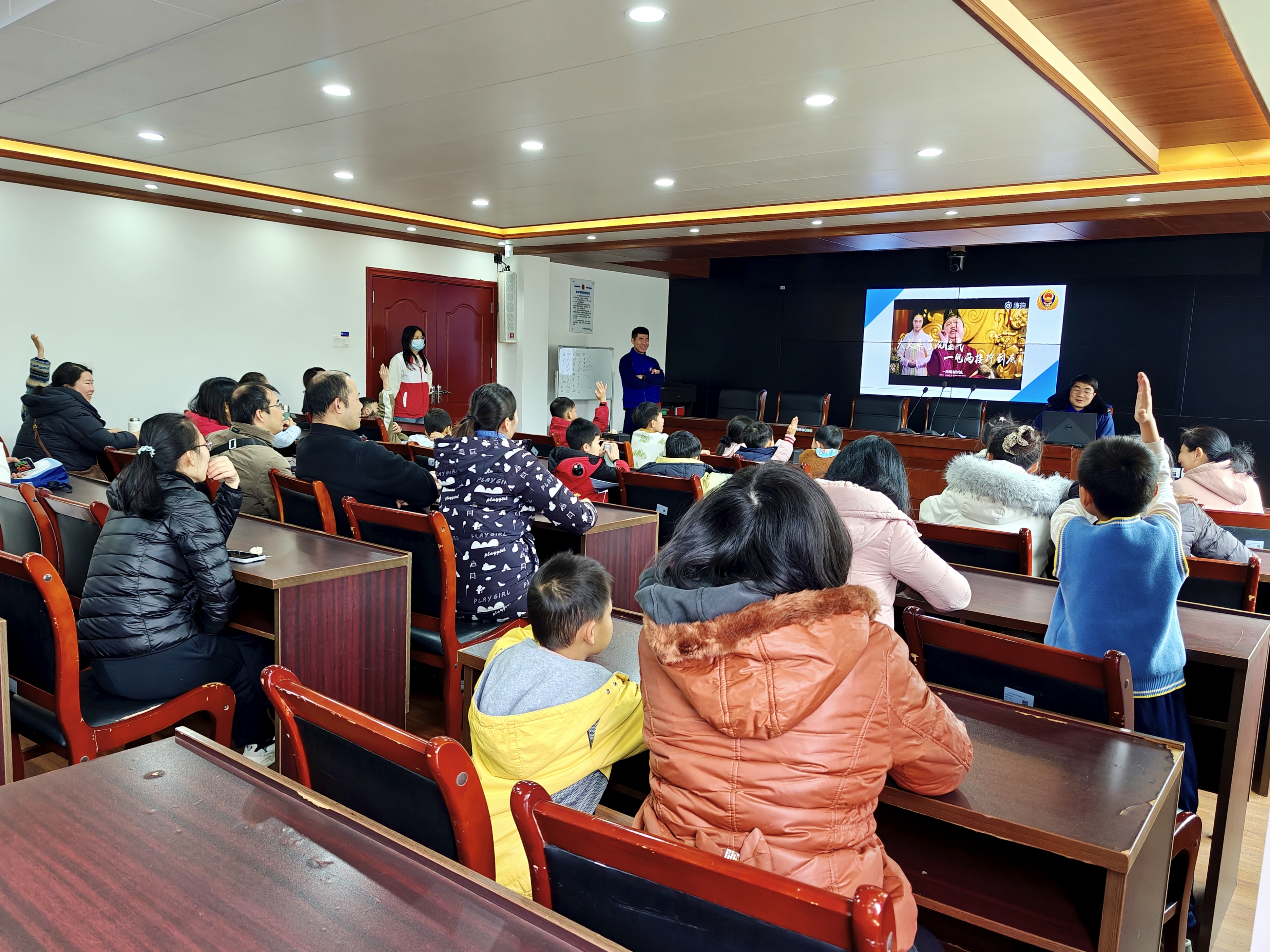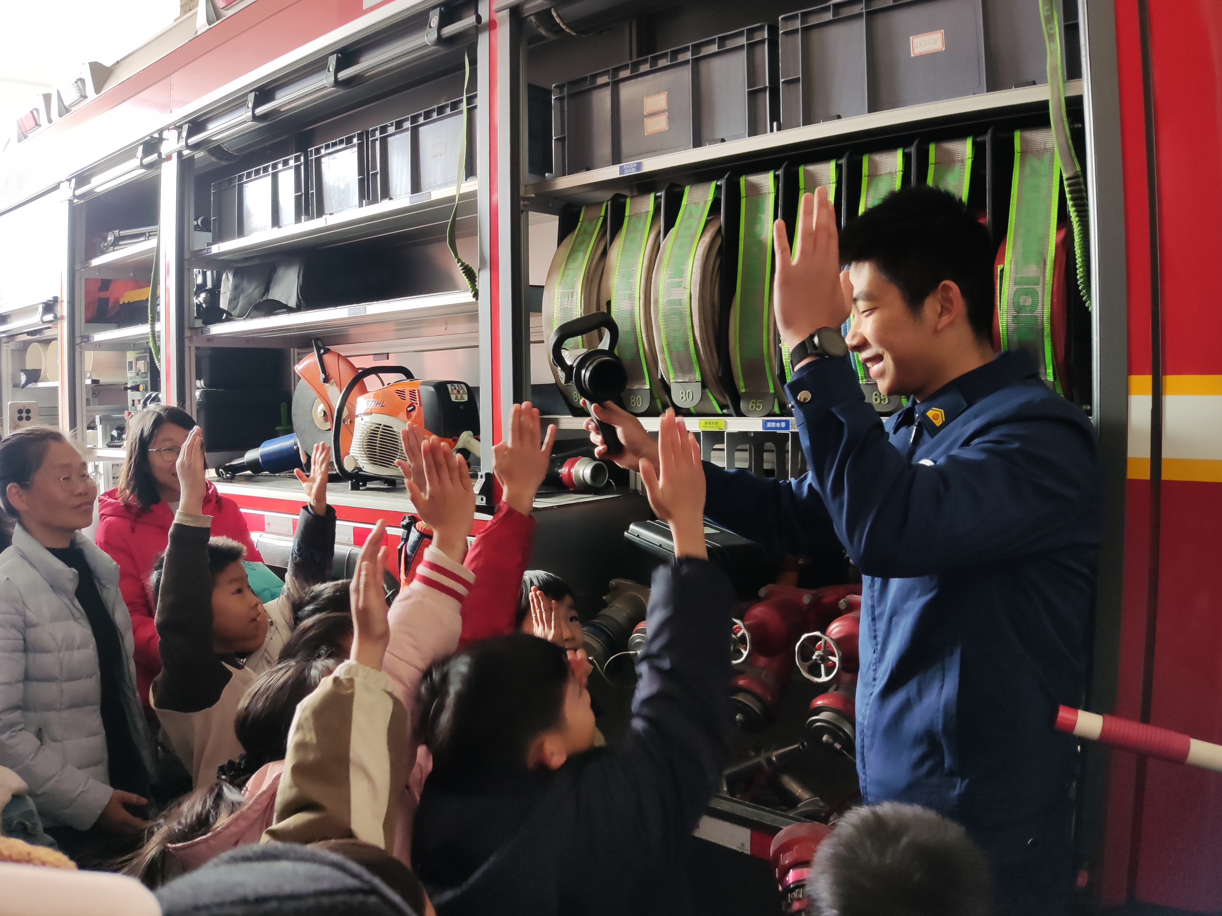 随后的互动环节将知识讲解与趣味问答融为一体。消防员结合动画短片和真实案例,生动讲解家庭防火、火场逃生等要点,并穿插有奖问答。“油锅起火能用水扑灭吗?”“火灾逃生时要不要乘坐电梯?”孩子们争相举手、踊跃抢答,现场气氛热烈。一位家长表示:“原来很多习以为常的操作竟是误区,这样的科普太有必要了!”