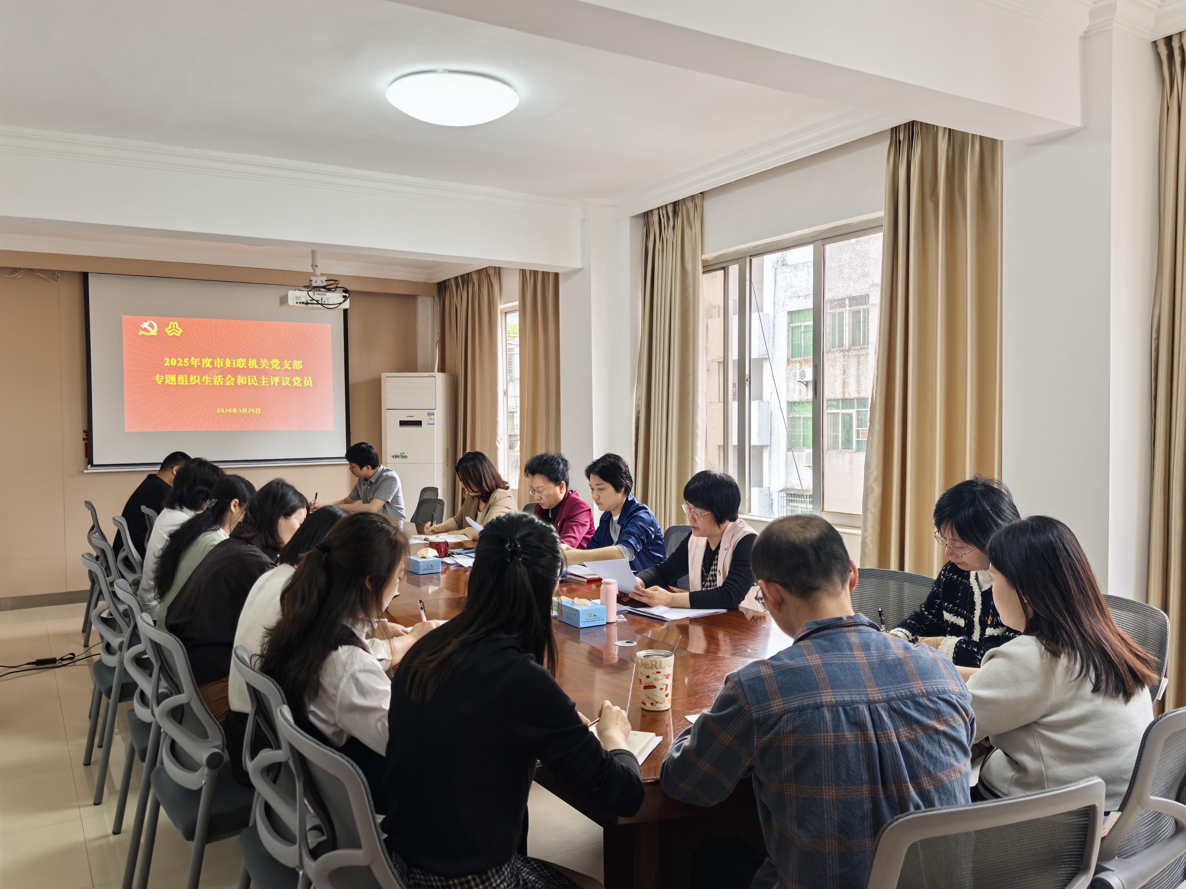 3月26日上午,市妇联机关党支部在九楼会议室召开第一季度党员大会暨2025年度组织生活会和民主评议党员会议,深入学习贯彻党的二十届四中全会精神和习近平新时代中国特色社会主义思想,巩固深化主题学习教育成果。支部在职党员参加会议。