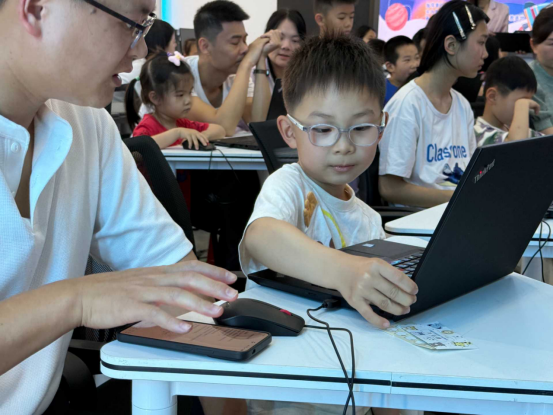 在AI数字绘本创作环节,亲子家庭以“不做拖延症”为主题,在专业老师指导下协同创作数字绘本。孩子们将时间管理理念融入创意故事,在动手实践中理解编程思维,学会主动规划时间;家长与孩子默契协作,在陪伴中拉近亲子距离,感受科技教育的温暖与力量。