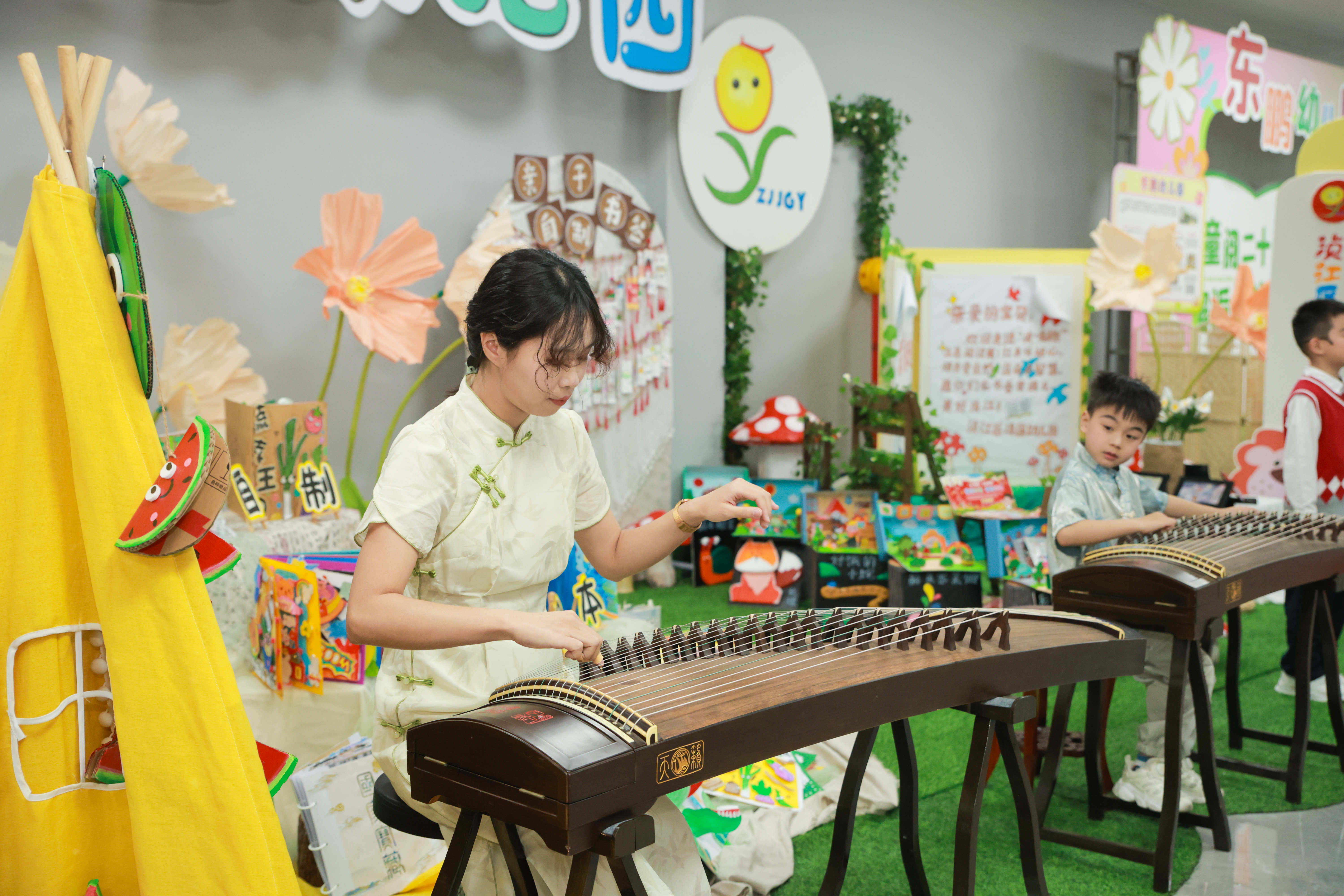 有的摊位以童趣绘画装点氛围,纸艺花朵与儿童画作相映成趣;有的融入传统文化,儿童现场轻弹古筝,琴声悠扬、古韵飘香;有的打造阅读互动游戏区,孩子们趣味打卡。笔墨书香与童真创意交相辉映,儿童创作、儿童讲解、儿童展示成为展区最亮眼的风景,充分展现孩子们在阅读中收获、在创作中成长、在展示中自信的美好模样。笔墨书香与创意装置交相辉映,静态展示与现场讲解相得益彰,形成“台上展风采、线下亮成果”的浓厚氛围。