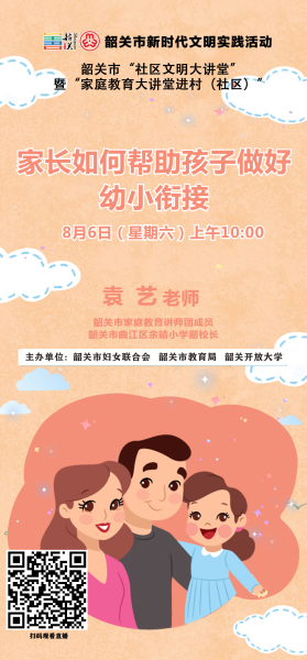 《父母学堂》第三十六期将邀请韶关市家庭教育讲师团成员、韶关市曲江区余靖小学副校长袁艺老师,以“家长如何帮助孩子做好幼小衔接”为主题,从讲述幼小双向衔接的任务、幼儿入学需备的素质、及幼儿入学的素质该如何提升等方面进行讲授。