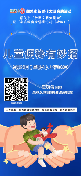 《父母学堂》第四十一期将邀请粤北人民医院儿科谭海智主治医师,给广大家庭带来“韶关父母学堂”全新公益课模块“家庭健康大讲堂”,以“儿童便秘有妙招”为主题,向广大家庭科普科学长高的家庭保健知识,给予多方位的家庭教育指导服务支持。