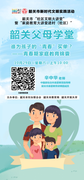 《父母学堂》第四十二期将邀请中国家校合作教育指导师、韶关市家庭教育讲师团成员辛中华老师,以“谁为孩子的‘青春’买单?——青春期家庭教育锦囊”为主题,以青春期孩子特点、家庭教育中遇到的难点等给予了关于如何做好青春期教育的贴心小锦囊,给予家长一定的指导和启发。
