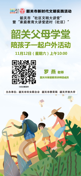《父母学堂》第四十四期将邀请韶关市家庭教育讲师团成员罗燕老师,以“陪孩子一起户外活动”为主题,从什么是户外运动、进行户外运动对孩子的好处、如何选择合适自己的户外运动,以及因地制宜开展户外活动等方面进行讲解,具有很强的实操性。